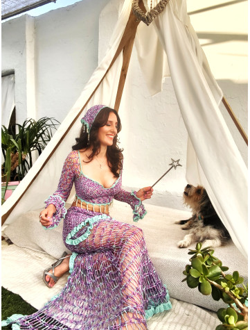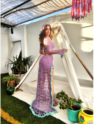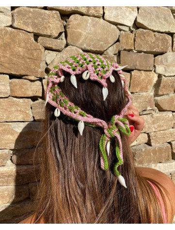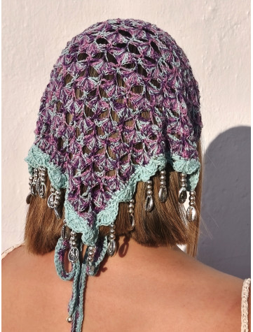 Este pañuelo único está elaborado a mano con hilo de alta calidad en tonos lilas y verde agua, formando un delicado diseño de red en crochet. Su borde está cuidadosamente decorado con cuentas metálicas y conchas naturales, aportando un...