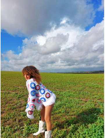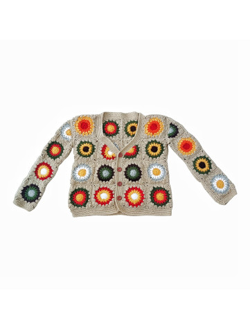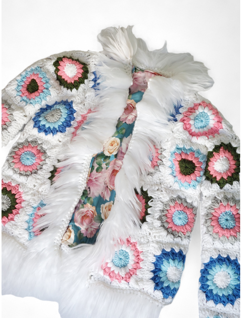 Revive la esencia de los años 70 con este encantador abrigo hecho a mano a crochet, utilizando la técnica de granny square. Su diseño retro presenta un fondo blanco que resalta un hermoso patrón de flores en una vibrante combinación de rosas, azules, verdes y grises. Cada detalle refleja la creatividad y el amor por lo artesanal. Además, cuenta con un forro estampado de flores que añade un toque extra de estilo y comodidad. Perfecto para quienes buscan una pieza única y llena de personalidad. ¡Hazlo tuyo y destaca con este abrigo exclusivo!